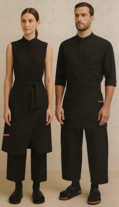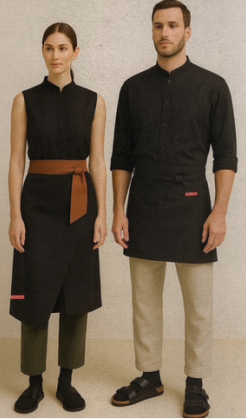Set Ella: Camisa sin mangas cuello Mao con botones pantalón tipo chef con bolsas en los costados pretina con elástico mandil medio tipo chef con bolsas personalizadas