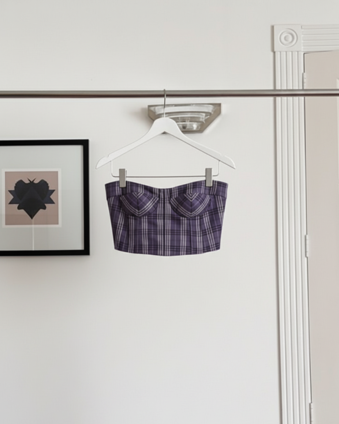 Este corset de cuadros combina estructura y suavidad en una pieza que realza la silueta con un aire contemporáneo. Confeccionado en una tela firme pero ligera, se ajusta al cuerpo mediante lazos en la parte trasera, permitiendo un fit personalizado y femenino. Su diseño con costuras marcadas y escote estructurado equilibra fuerza y delicadeza.