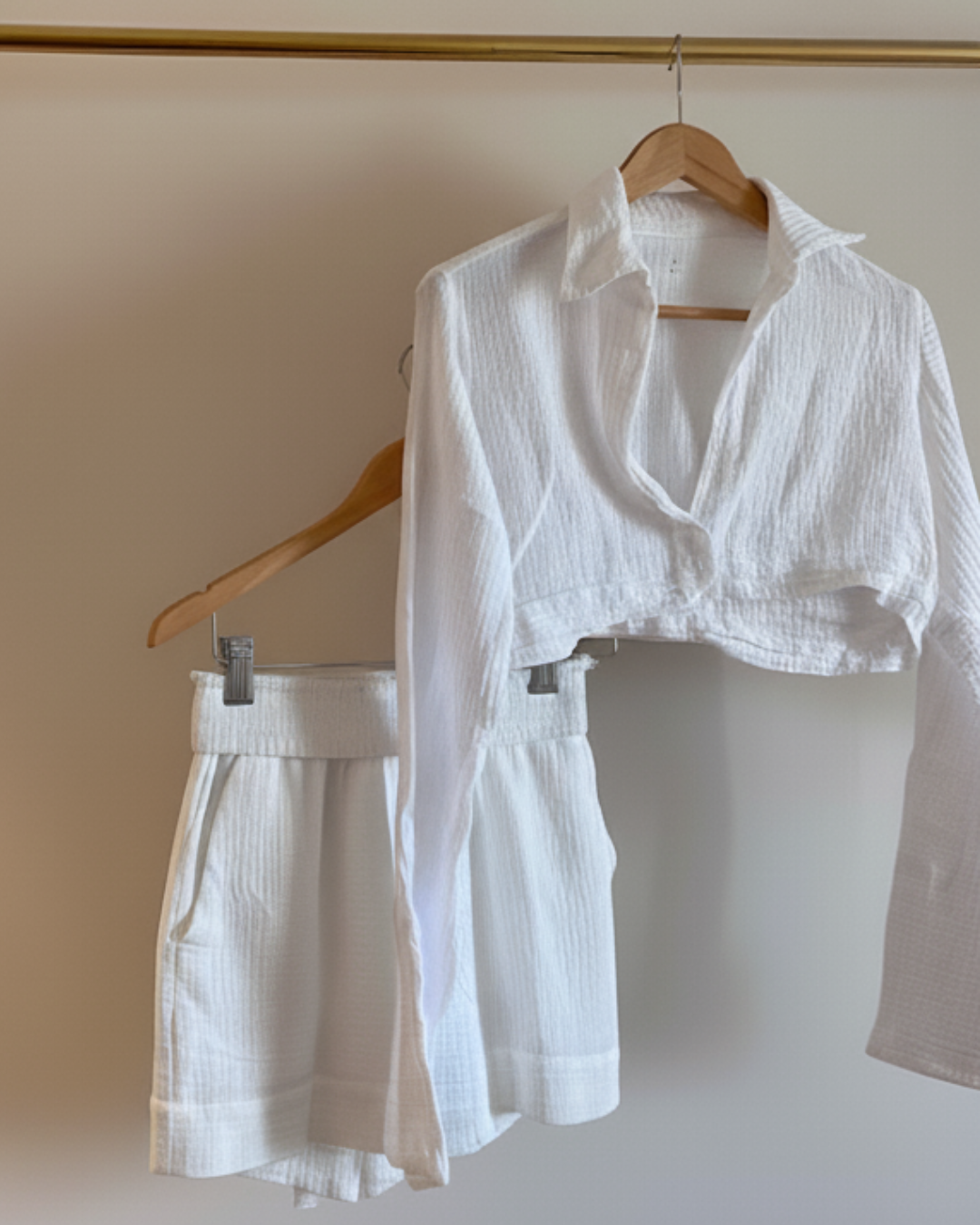 Este crop top de algodón 100% texturizado combina comodidad y estilo en un diseño fresco y versátil. Presenta un botón japonés al frente, que aporta un detalle delicado y contemporáneo, y mangas amplias que le dan movimiento y un aire relajado.