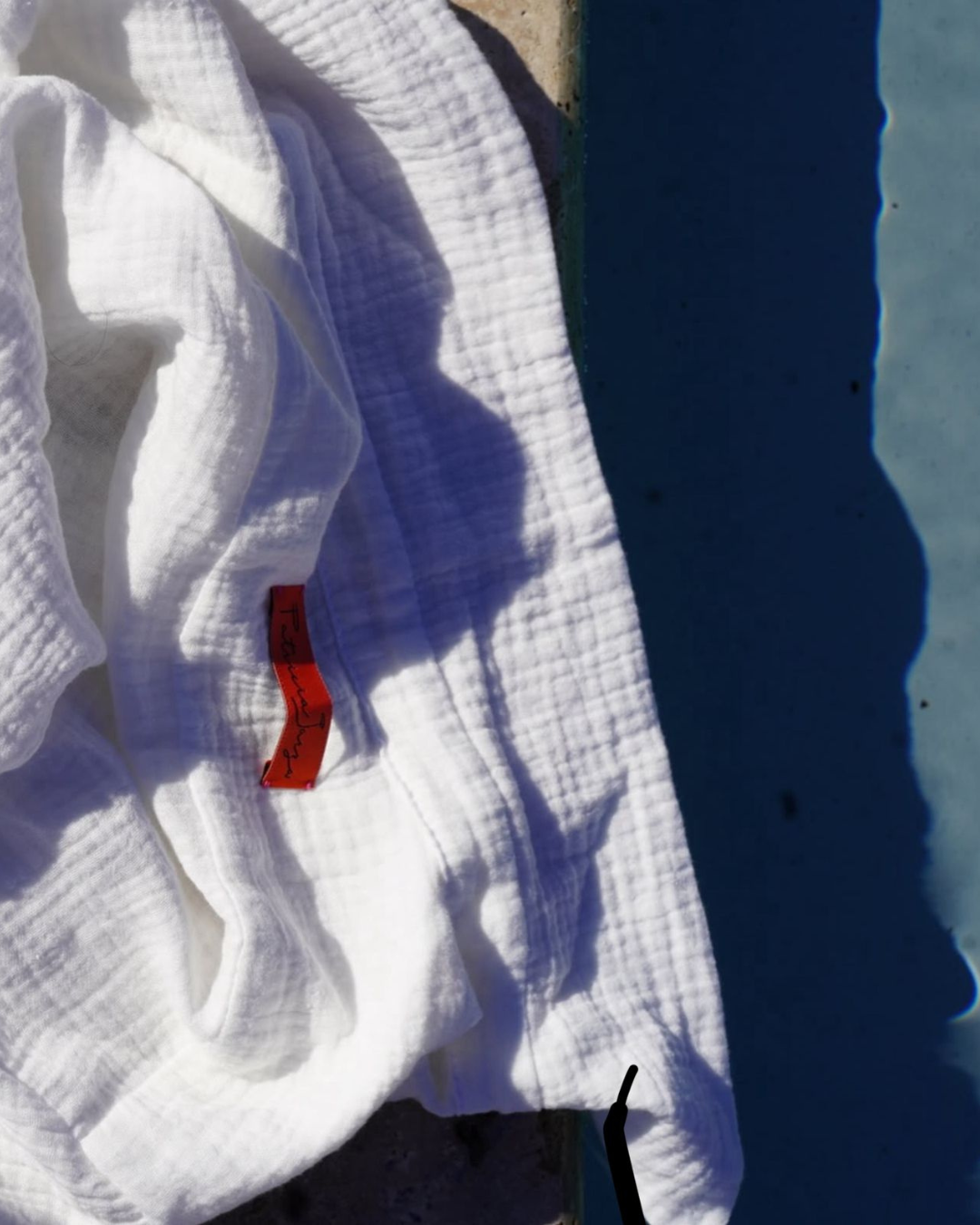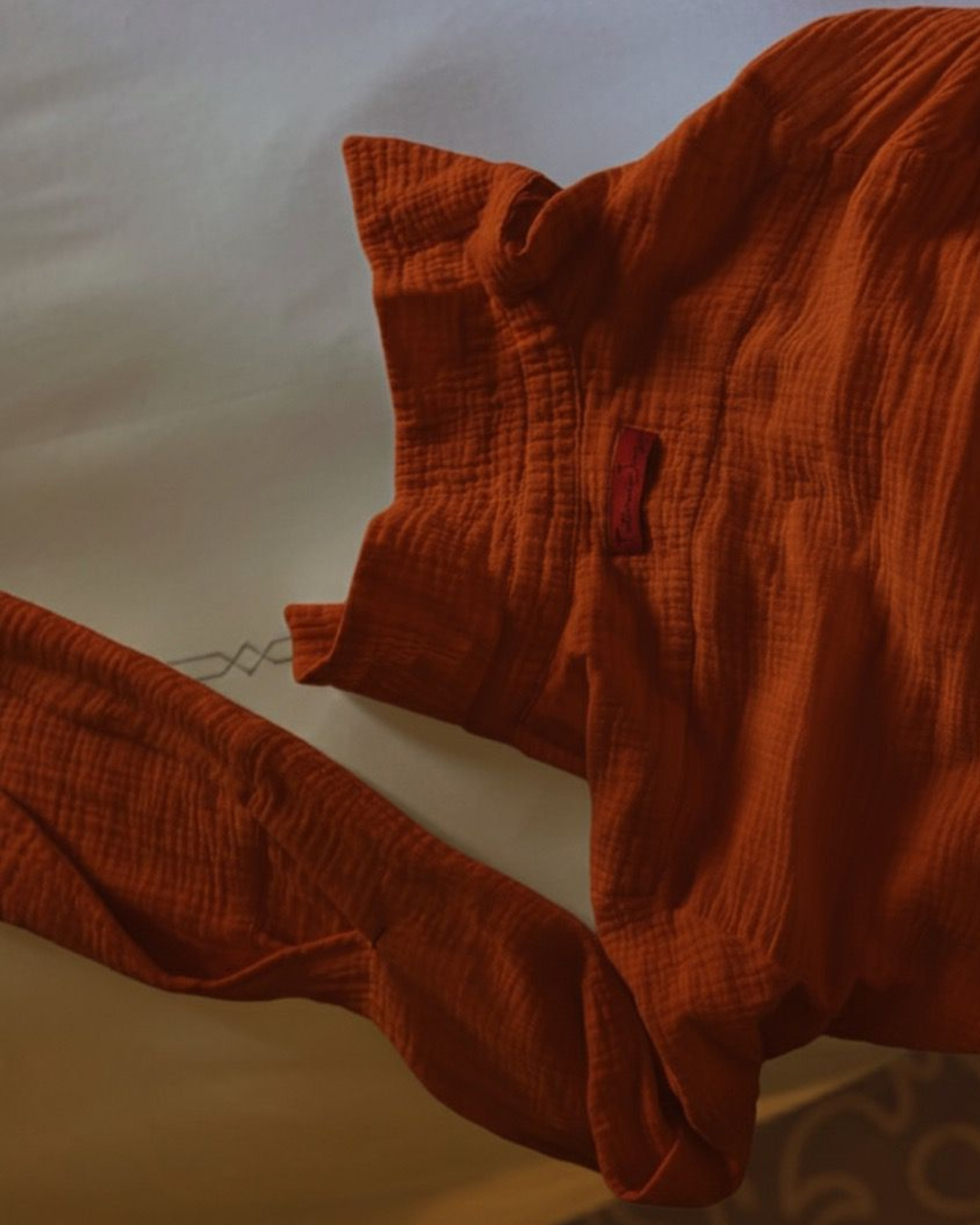 Disponible en color blanco, limpio y atemporal, y en burnt orange, un tono cálido y terroso que resalta la textura del tejido.