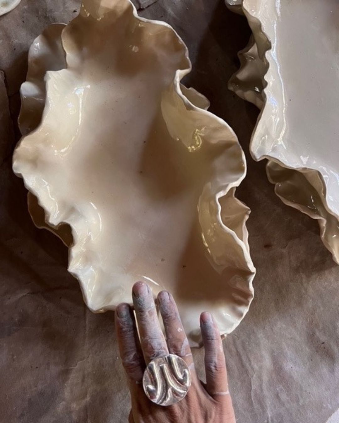 El esmalte transparente resalta el tono natural de la arcilla, haciendo de cada pieza una obra única, pensada para enaltecer tanto los platillos como los espacios que habita. Cada pieza es única, con ondulaciones que recuerdan al oleaje y al gesto libre de la mano que la crea.