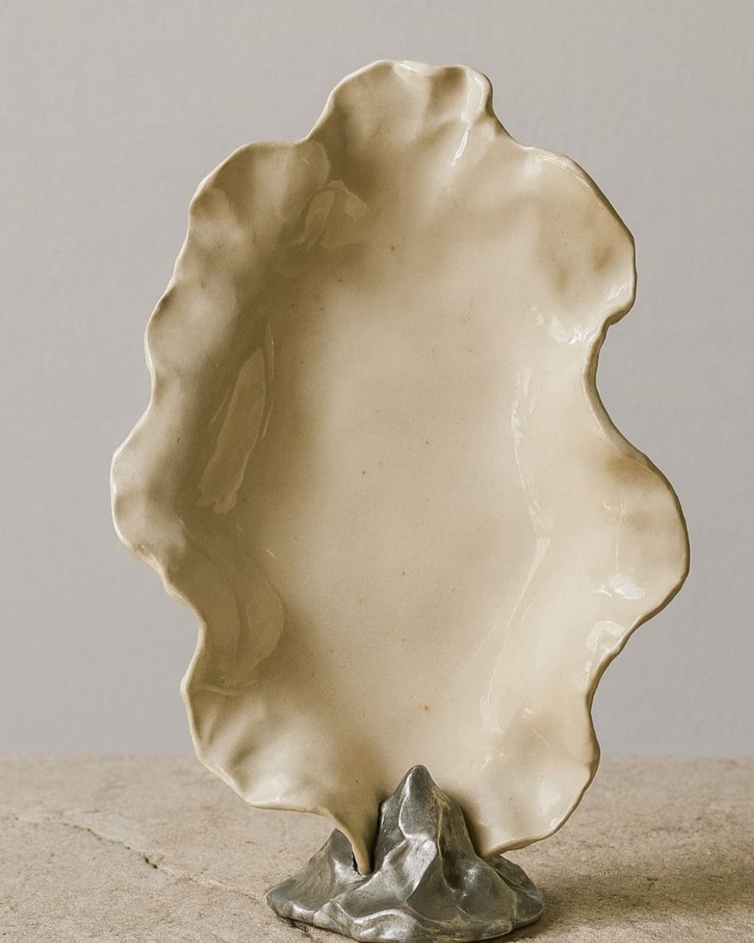 Modelado a mano en cerámica de alta temperatura (23 x 28 cm) y esmaltado en tono transparente, su superficie refleja la luz como un paisaje líquido.