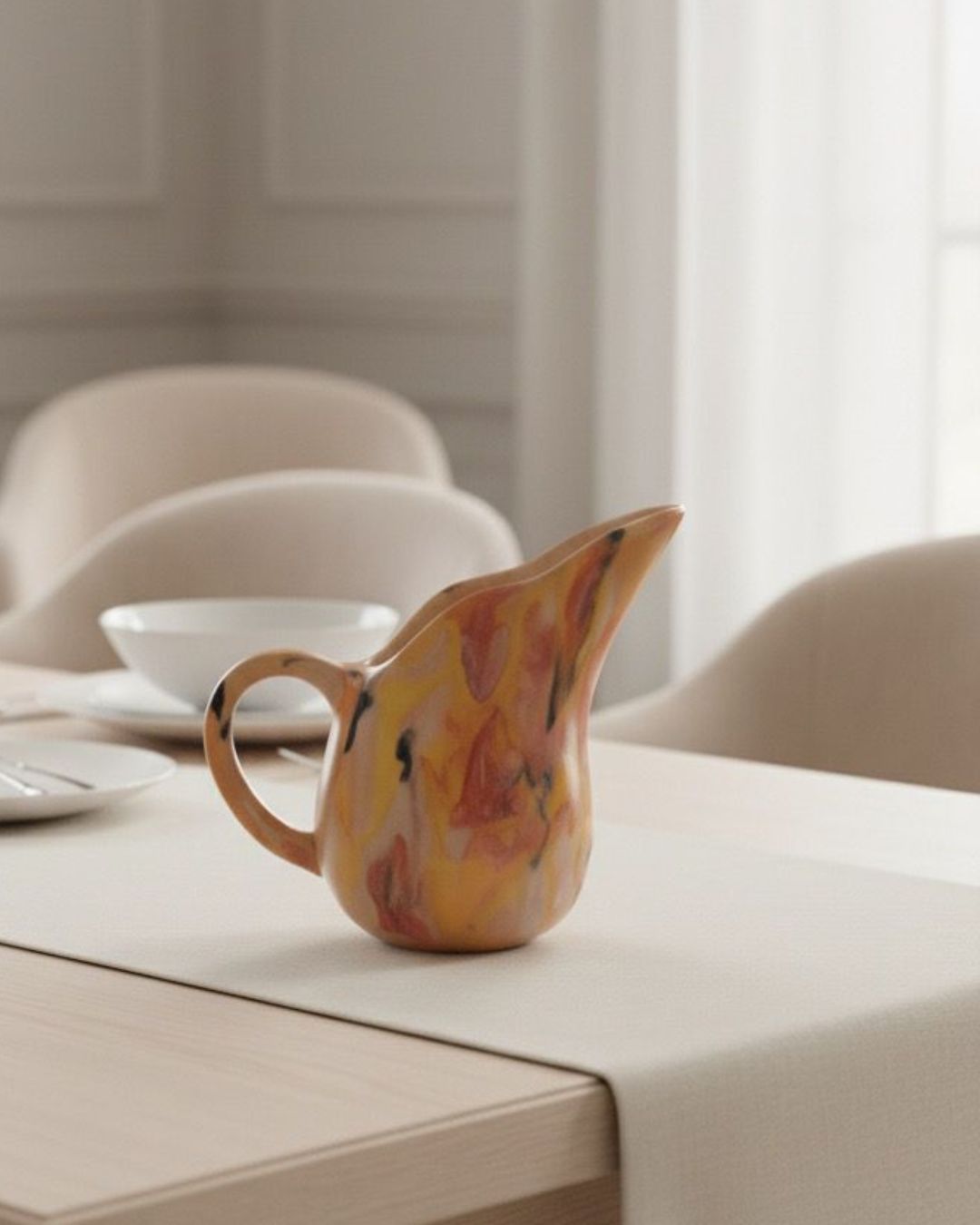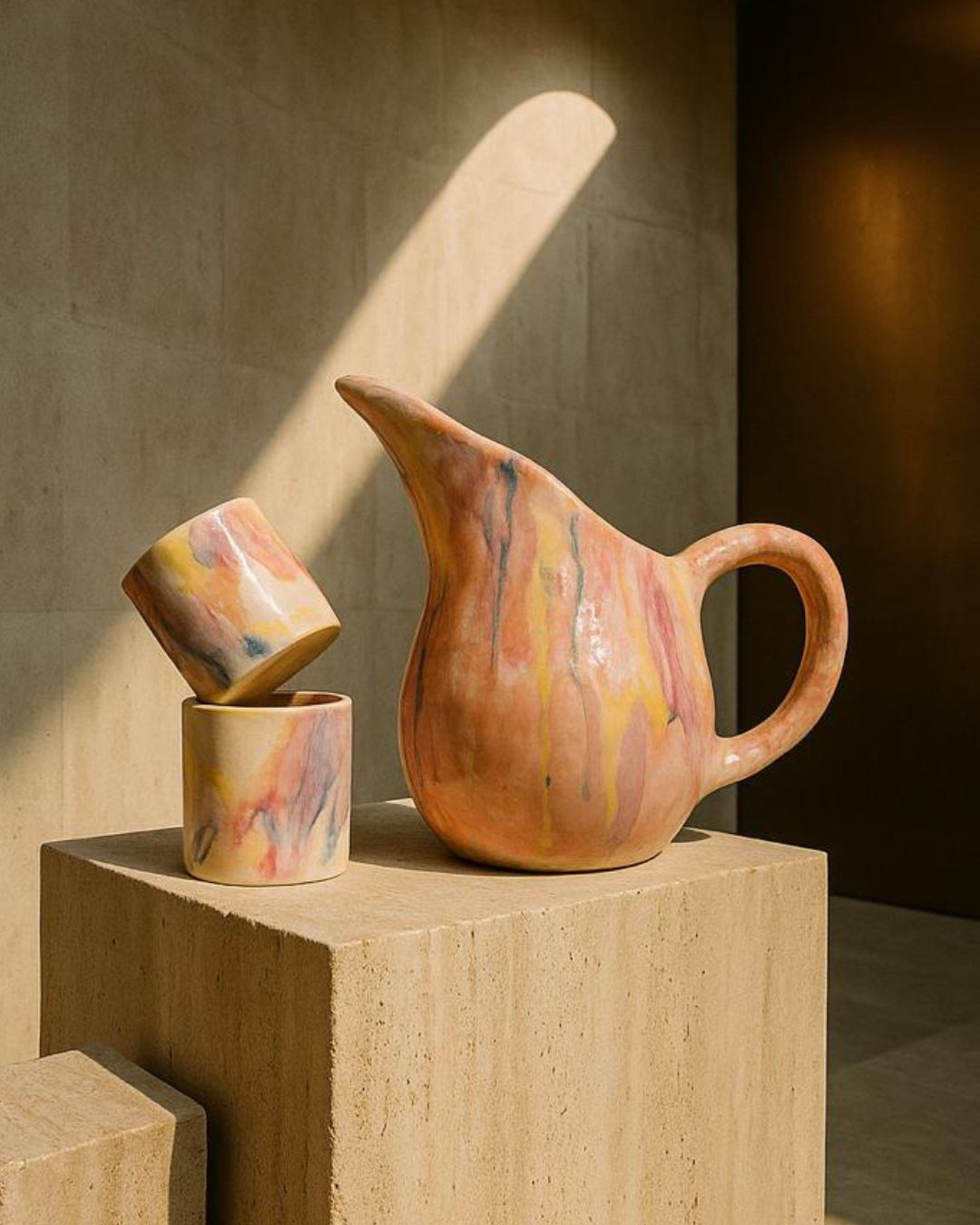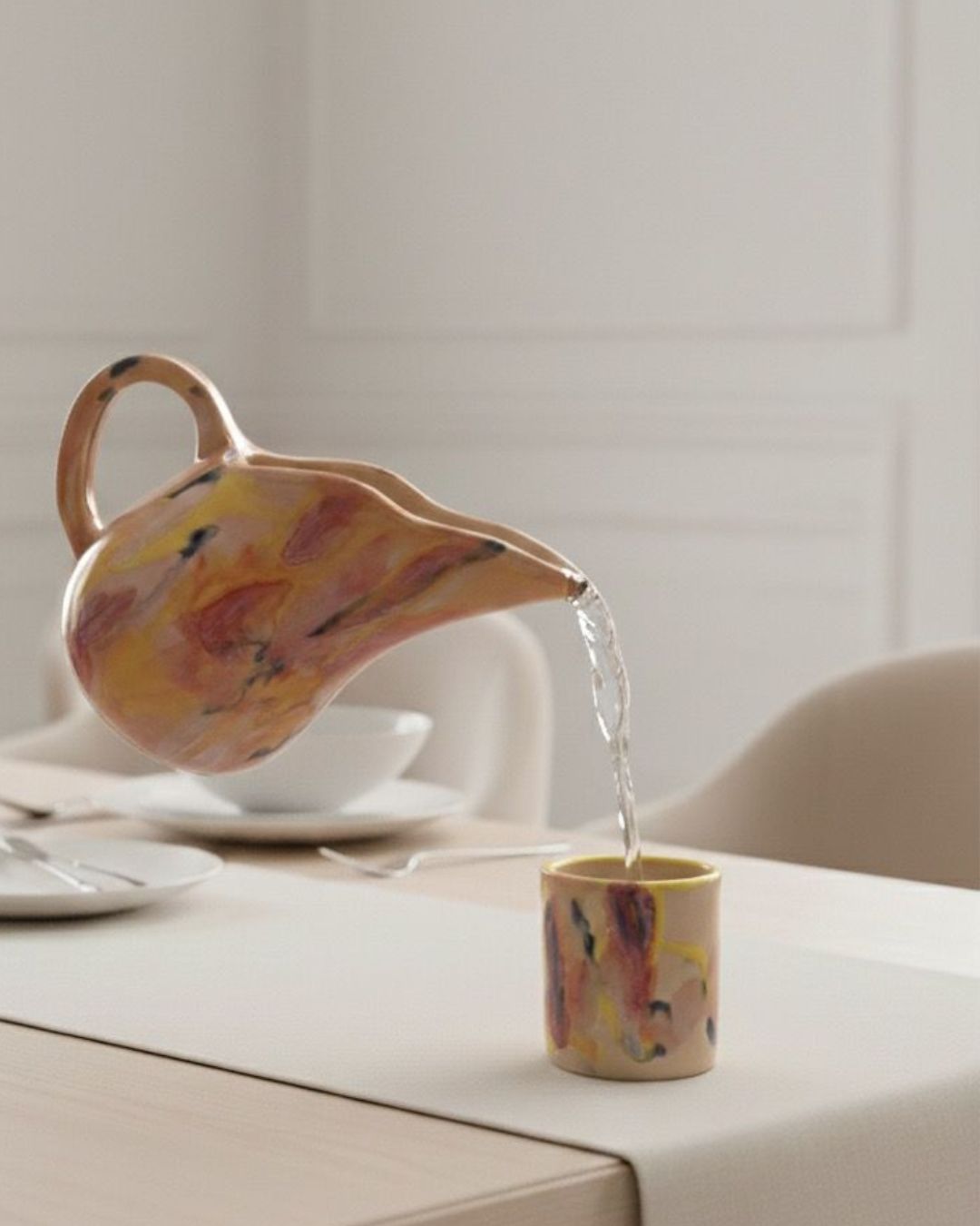 Con una capacidad de 1 litro y acompañada de dos vasos de 10 cm, este set une lo funcional con lo escultórico, transformando lo cotidiano en un ritual de calma y contemplación.